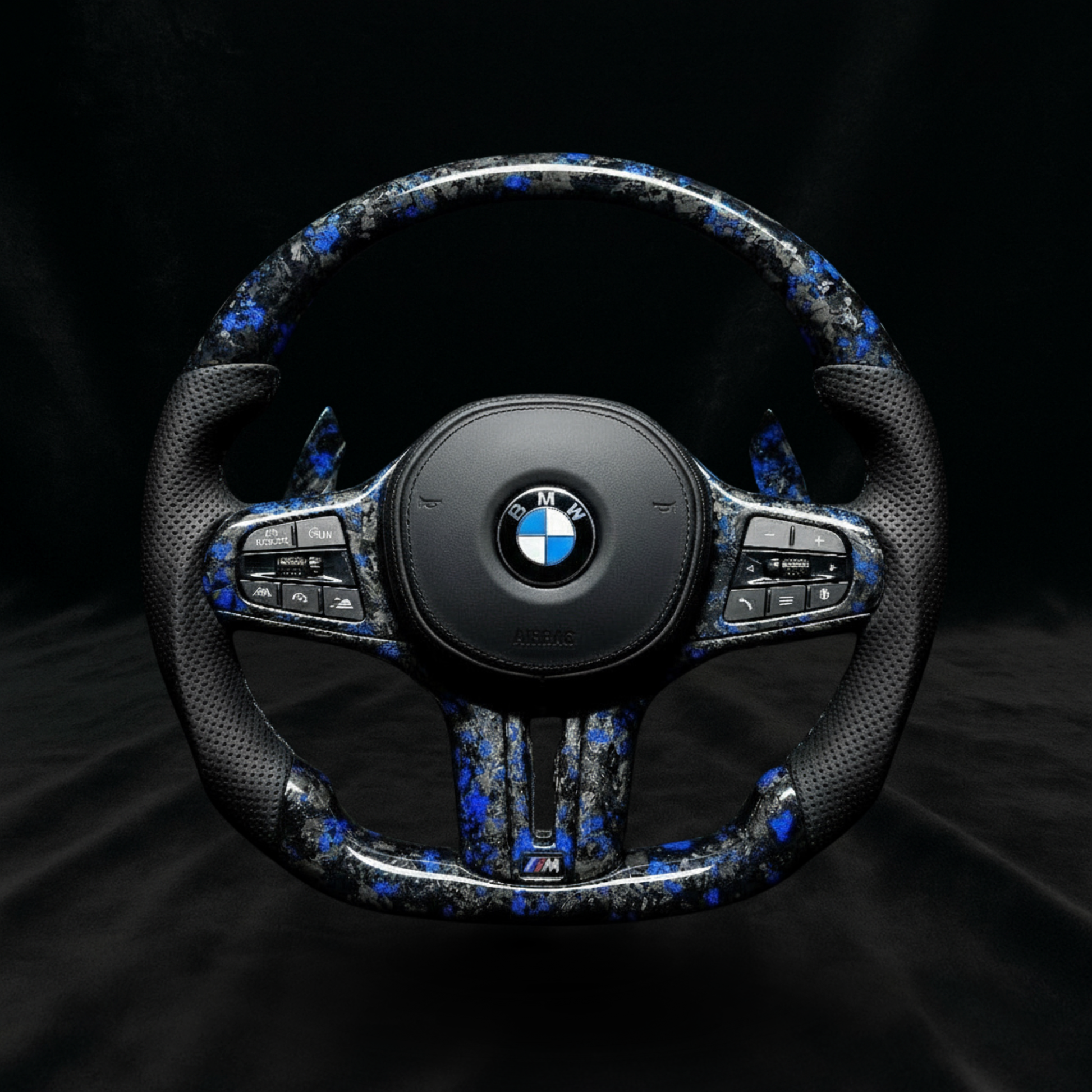 Oppgrader kjøreopplevelsen og interiørstilen i din BMW G-serie med et eksklusivt Blå Forged Carbon Fiber & skinn-ratt. Den unike blå karbonstrukturen kombinert med premium skinn skaper et luksuriøst, moderne og motorsport-inspirert uttrykk som virkelig skiller seg ut i kupéen.